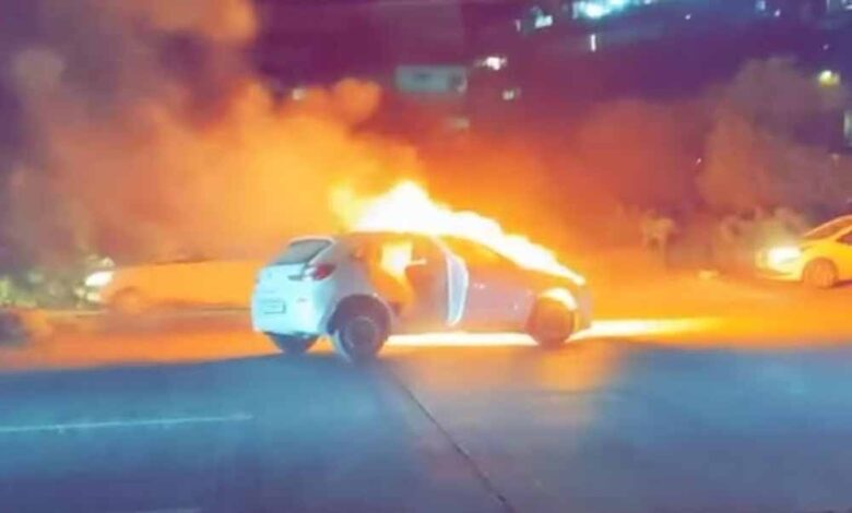 शॉर्ट सर्किट से इंजन में हुआ ब्लास्ट, परिवार सुरक्षित बाहर निकल आया, भीषण आग में पूरी कार जल गई